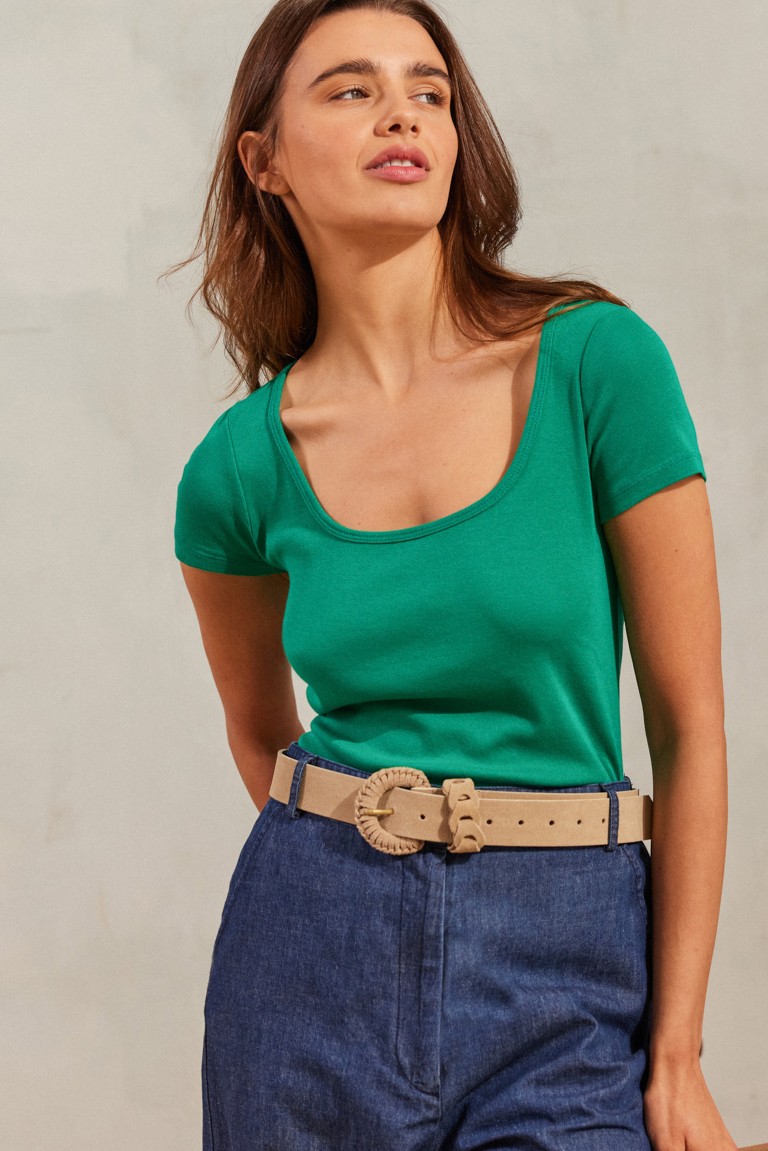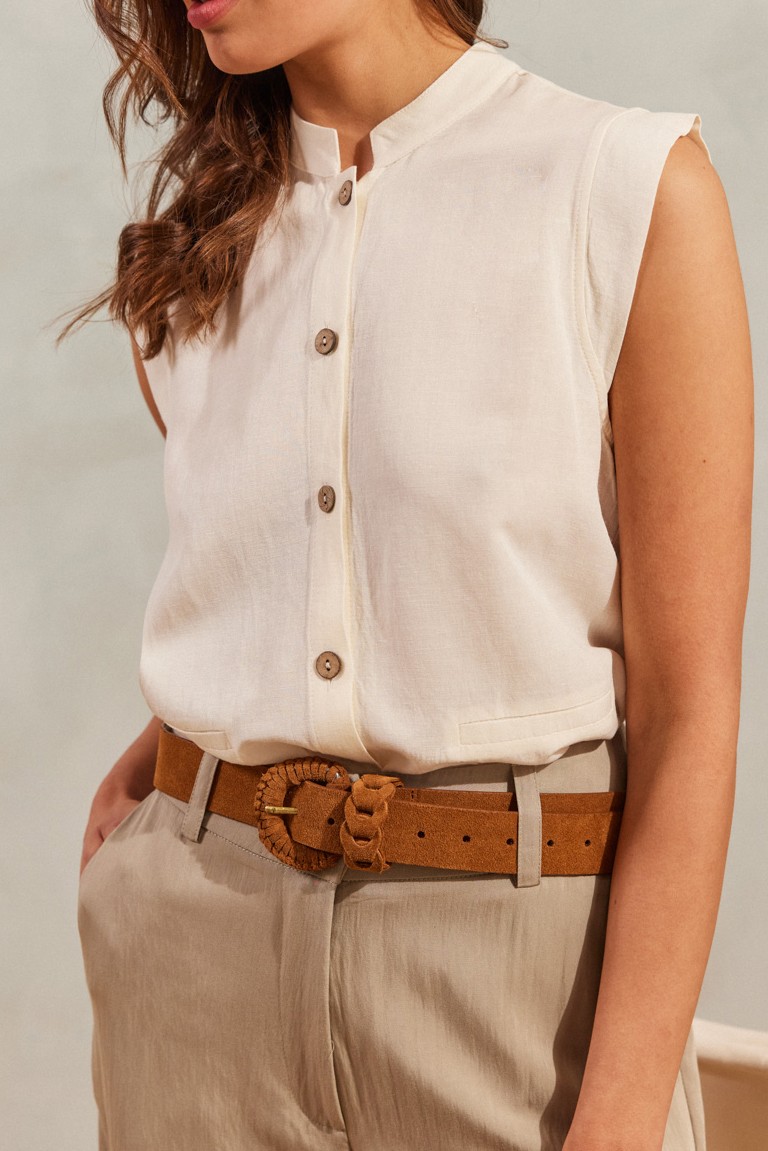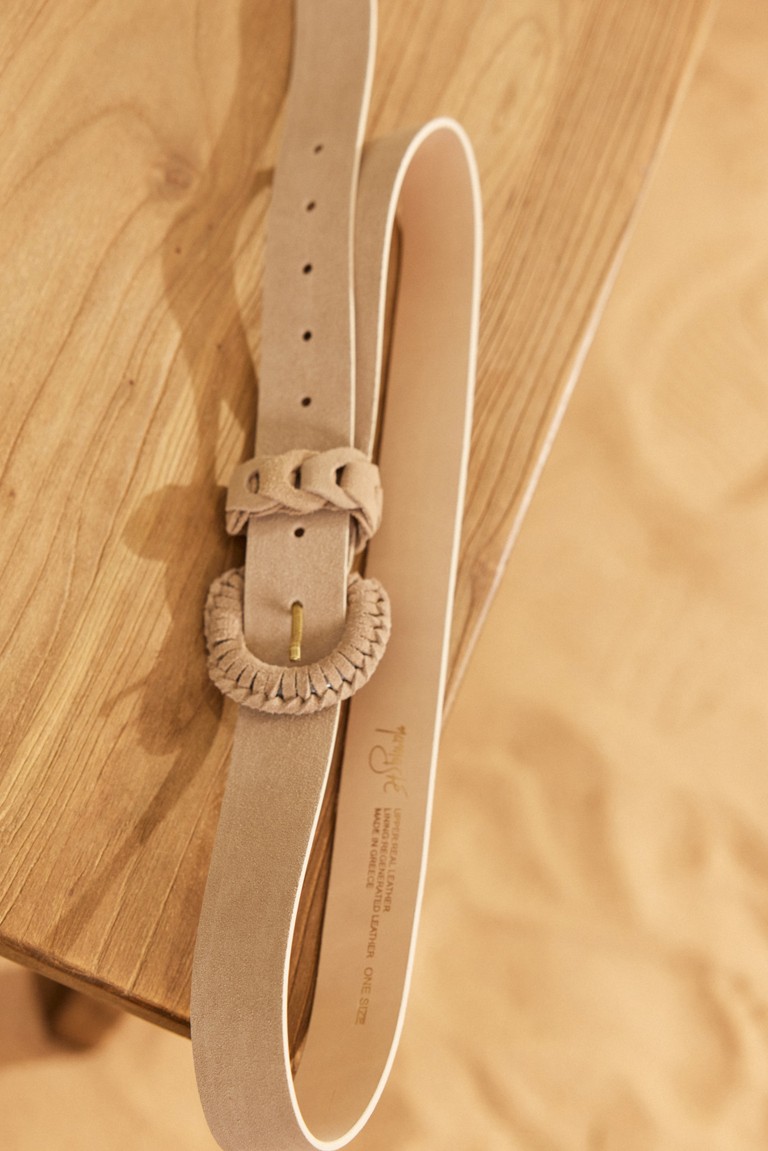 Ζώνη καστόρινη δερμάτινη, με ιδιαίτερη πλεκτή αγκράφα και πλεκτό θυλάκι στο ίδιο ύφος. Μήκος 1,05 m. φάρδος 3,5 εκ. και 9 τρύπες για ευέλικτη εφαρμογή. Μια ζώνη με ρετρό διάθεση και ξεχωριστό χαρακτήρα.