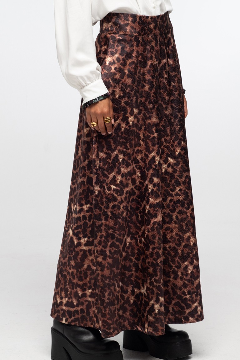 Η Rosette Long Skirt έχει ένα κομψό σχέδιο με λεοπάρ μοτίβο πάνω σε σατέν jacquard ύφασμα. Αγκαλιάζει τη μέση ψηλά, έχει φαρδιά Α γραμμή, λάστιχο στο πίσω μέρος και κρυφό φερμουάρ. Συνδυάζεται εύκολα με πολλά χρώματα και prints. Φορέστε τη με το Ivy Blazer, πάνω από το Anemone Shirt και το Bloom Cap για ένα look που συνδυάζει το επαγγελματικό με το casual. Αυτό το προϊόν έχει δημιουργηθεί με την τεχνική all-over, όπου το μοτίβο εκτυπώνεται σε όλη την επιφάνεια του υφάσματος. Η θέση του μοτίβου μπορεί να παρουσιάζει μικρές παραλλαγές, χαρίζοντας μια διακριτική μοναδικότητα σε κάθε κομμάτι της παραγωγής.