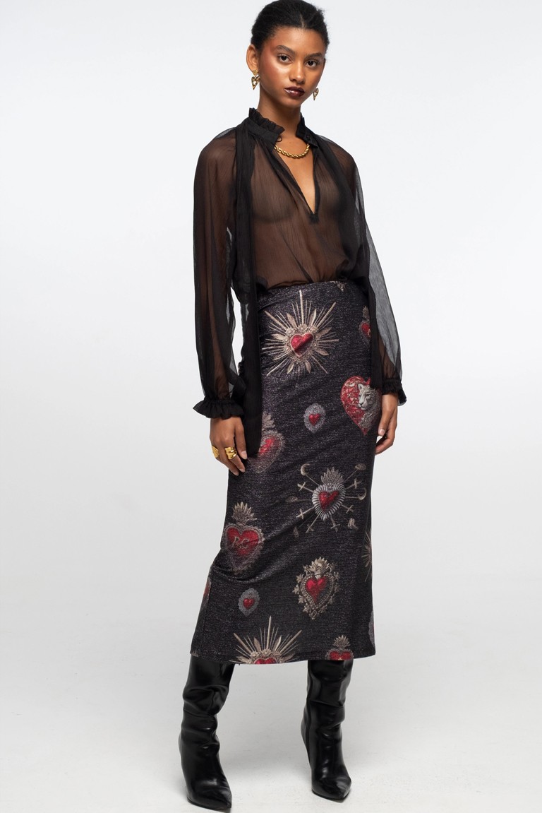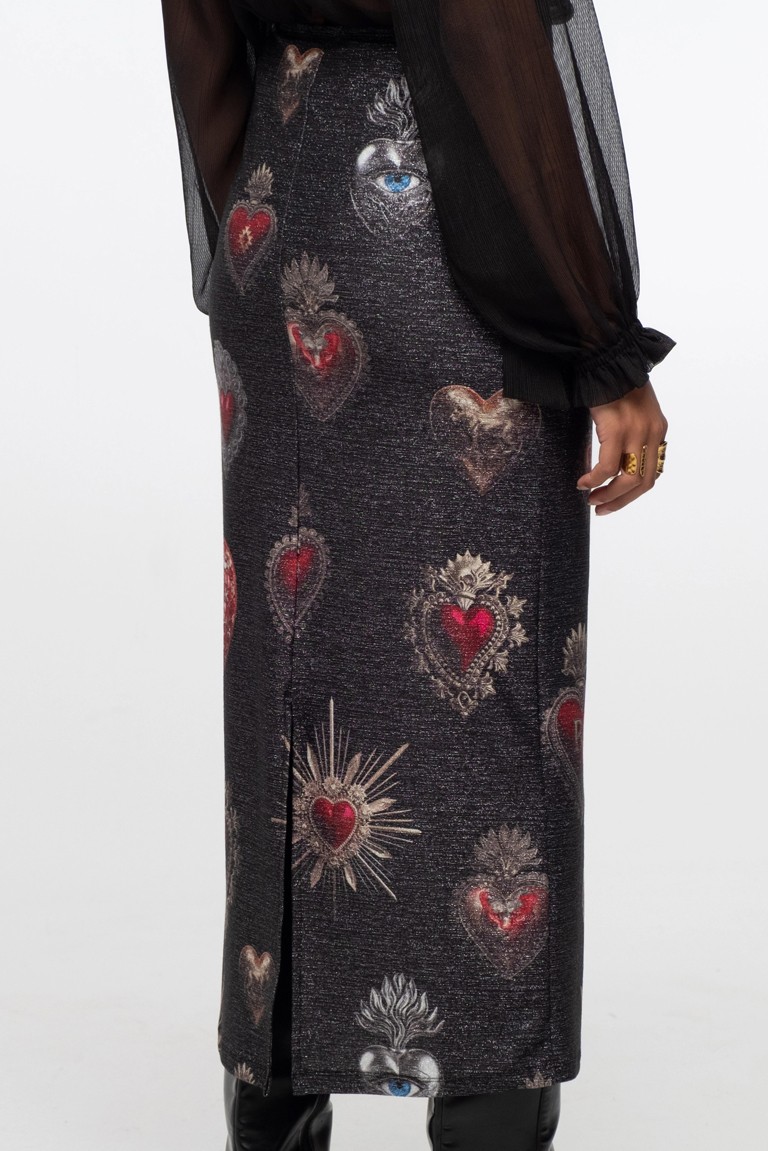 Η Elisium Midi Skirt συνδυάζει ένα ιδιαίτερο all-over print σχέδιο με τη διακριτική λάμψη του lurex jersey υφάσματος. Το stretch ύφασμα της και η ελαστική μέση χαρίζουν άνετη, εφαρμοστή γραμμή, ενώ το σκίσιμο στο πίσω μέρος αυτής της ίσιας midi φούστας, διευκολύνει την κίνηση. Για κομψές εμφανίσεις από το γραφείο μέχρι την έξοδο, συνδυάστε την με το Dainty Top.