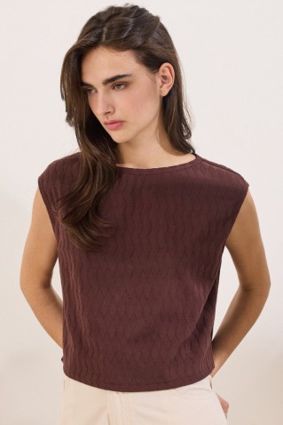 Τοπ αμάνικο από ανάλαφρο ύφασμα με διακριτικό ανάγλυφο vintage floral μοτίβο που προσθέτει υφή και κομψότητα. Διαθέτει άνετη, ίσια και λιτή γραμμή με στρογγυλή λαιμόκοψη μπροστά, ενώ στο πίσω μέρος...