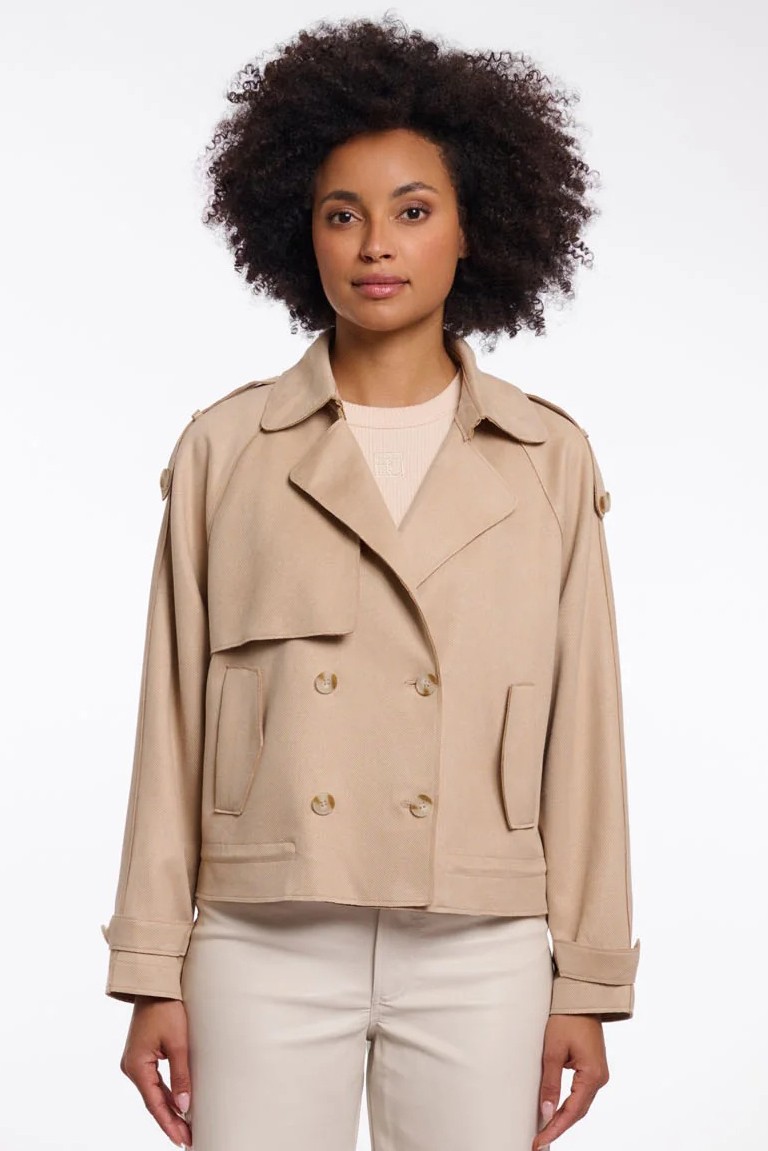 Τυλίξτε τον εαυτό σας σε μοντέρνα κομψότητα με αυτό το κοντό trench coat, κατασκευασμένο από απαλό faux σουέτ για μια κομψή, εκλεπτυσμένη εμφάνιση. Σχεδιασμένο με κλασικές, μοντέρνες λεπτομέρειες, διπλό κούμπωμα με κουμπιά, λαβές ώμου, λουράκια στα μανίκια και τσέπες με ρέλι, προσφέρει μια διαχρονική αλλά και μοντέρνα σιλουέτα. Η ίσια εφαρμογή και τα δομημένα πέτα το καθιστούν ιδανική επιλογή για καθημερινή χρήση.
