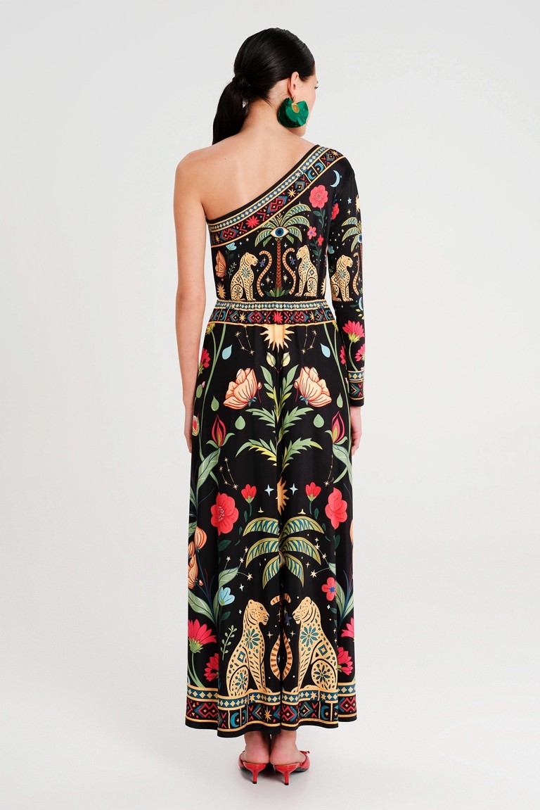 Το Eternity One Shoulder Long Dress είναι ένα μακρύ φόρεμα με έναν ώμο. Είναι φτιαγμένο από μαλακό jersey ύφασμα και έχει ένα μακρύ μανίκι. Η μέση έχει λάστιχο και από εκεί το φόρεμα ανοίγει σε Α-γραμμή. Συνοδεύεται από ζώνη στο ίδιο ύφασμα για να τονίζει τη μέση.