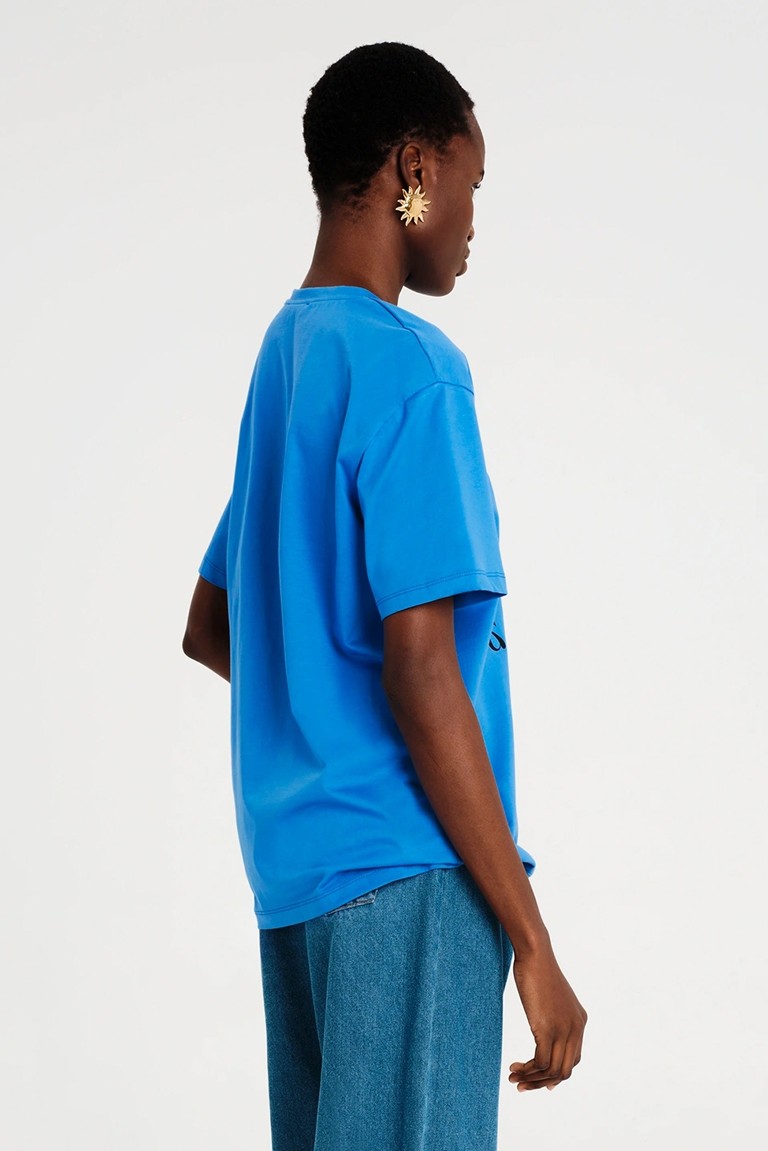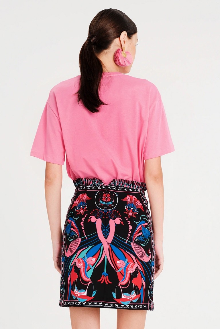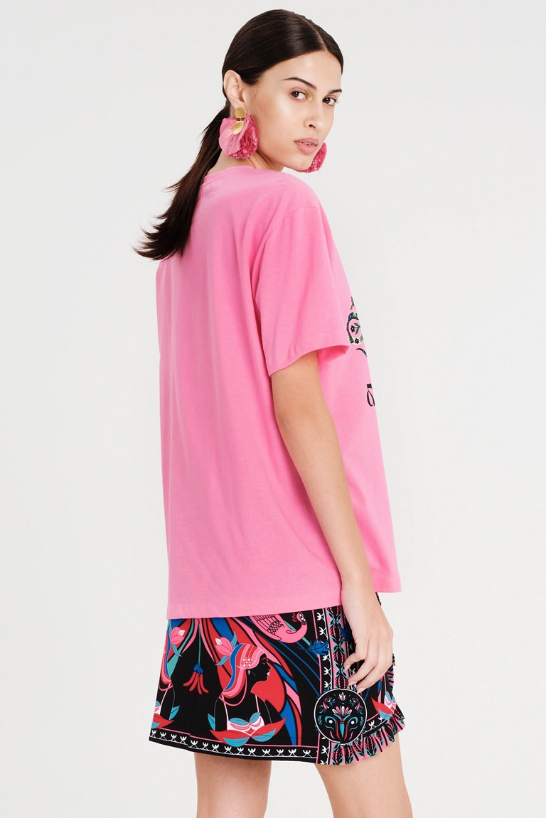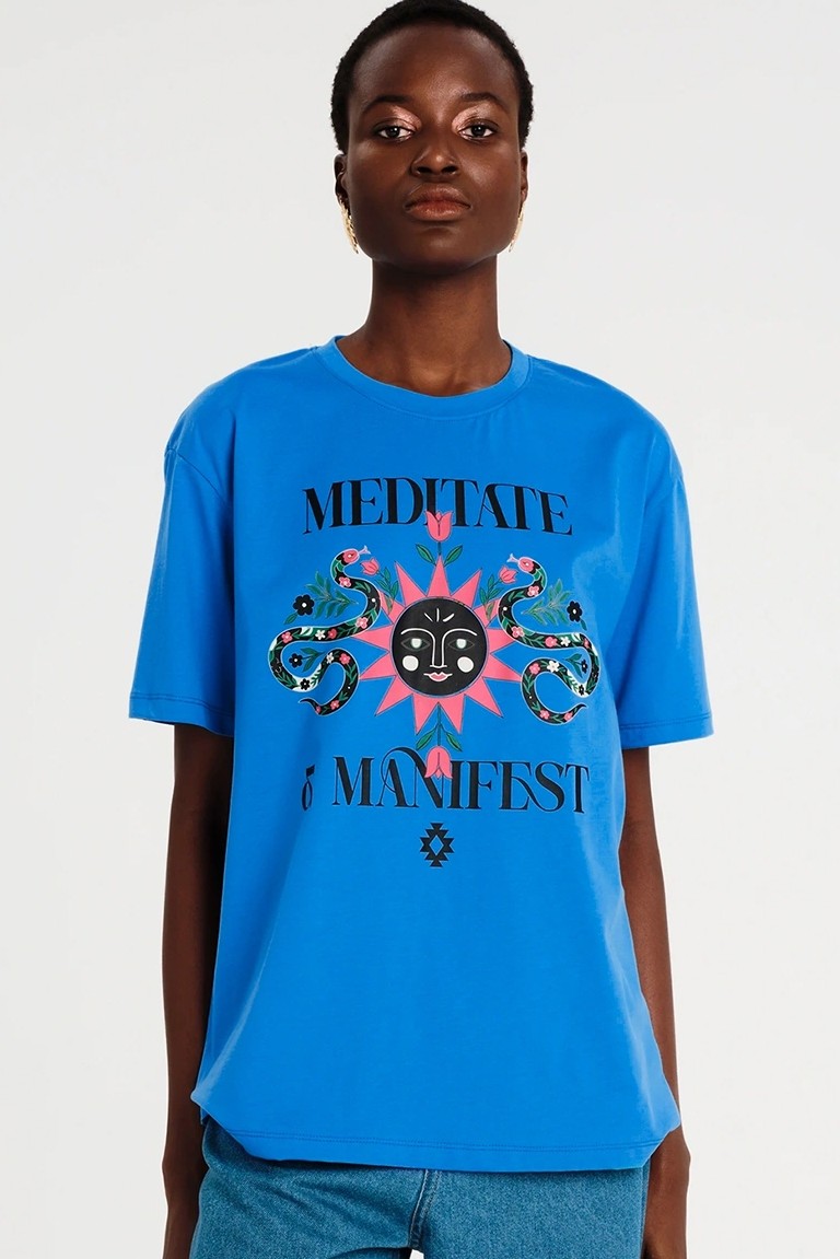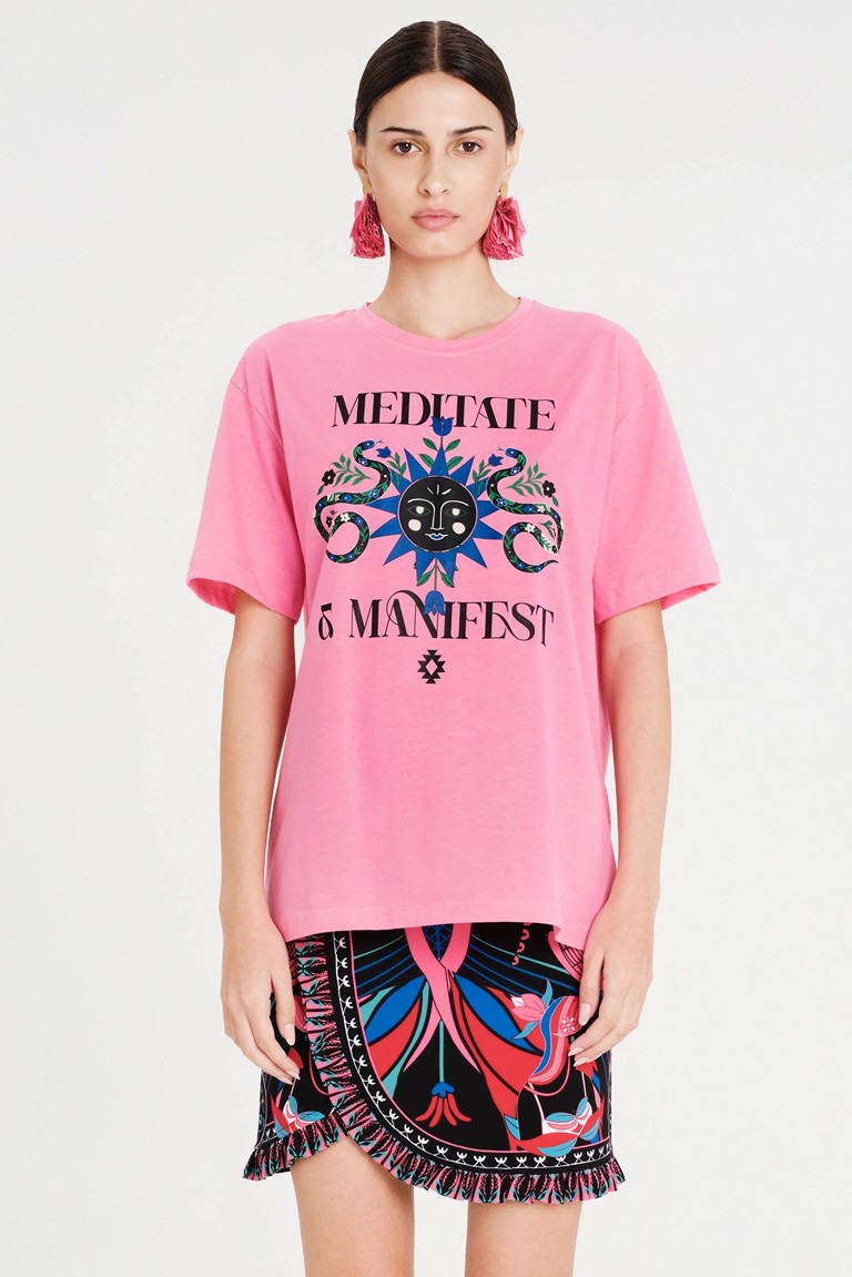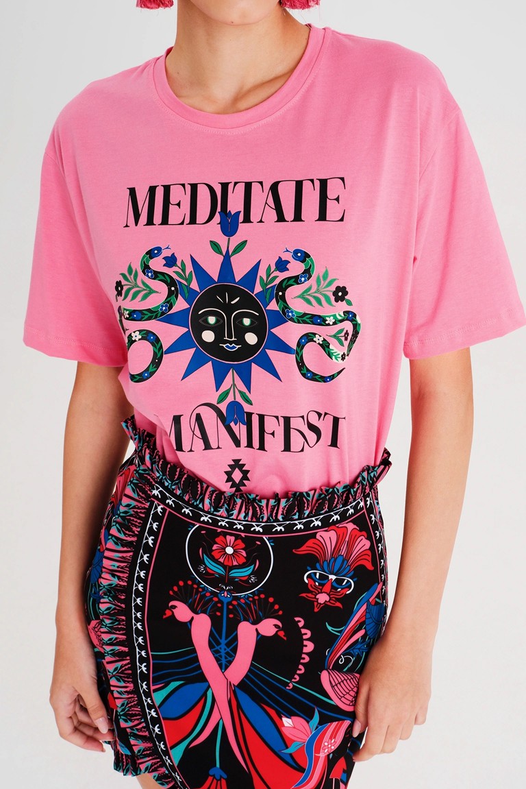 Το Manifestation T-Shirt έχει χαλαρή γραμμή και είναι φτιαγμένο από βαμβακερό ύφασμα, συνδυάζοντας άνεση και στιλ. Το έντονο print του περιλαμβάνει φίδια, ήλιους και στοιχεία με σύμβολα. Διατίθεται σε ροζ ή μπλε χρώμα και μπορεί να φορεθεί με τη Cosmology Mini Skirt.