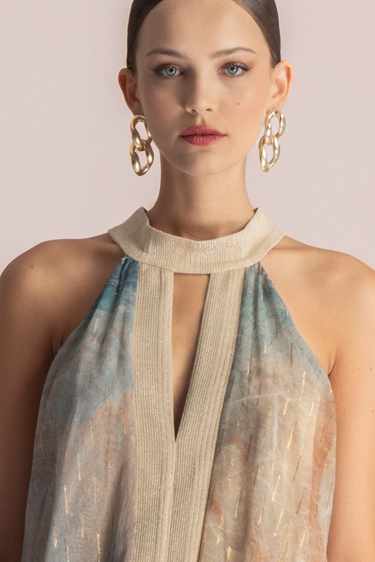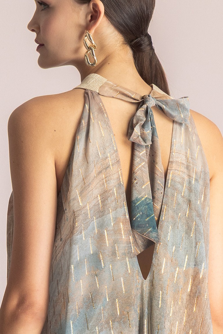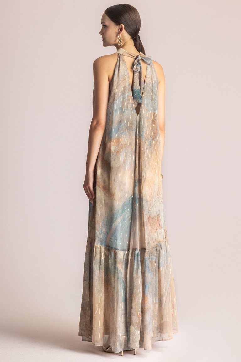 Μακρύ εμπριμέ φόρεμα που δένει στο λαιμό