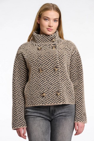 Κοντό μπουφάν, συνδυασμός πλεκτού και συνθετικής γούνας,ψηλός γιακάς κλείσιμο με φερμουάρ.62% ακρυλικό, 38% πολυεστέρας, φόδρα 100% βισκόζηΣχεδιασμένο και κατασκευασμένο στην Ελλάδα