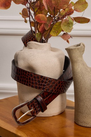 Κομψή ζώνη από δέρμα με ανάγλυφη κροκό υφή, που προσδίδει διαχρονική πολυτέλεια και χαρακτήρα. Έχει μήκος 1,03 μ. και διαθέτει 9 τρύπες για ρύθμιση της εφαρμογής. Η αγκράφα, επενδυμένη με το ίδιο...