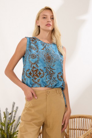 Top αμάνικο με στρογγυλή λαιμόκοψη και σούρες στους ώμους που διαμορφώνουν το σχήμα. Διαθέτει κορδόνι από το ίδιο ύφασμα στο τελείωμα για ρυθμιζόμενη εφαρμογή, διακοσμημένο με χάντρες. Το boho...