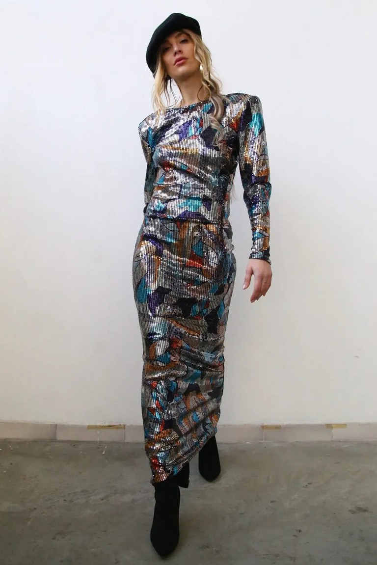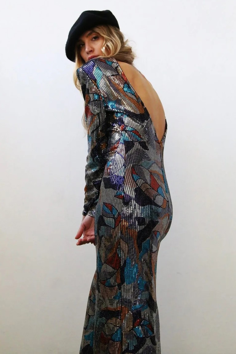 Long dress with v-neckline on the back For your day and evening looks Slightly stretch fabric in multicolored sequin pattern