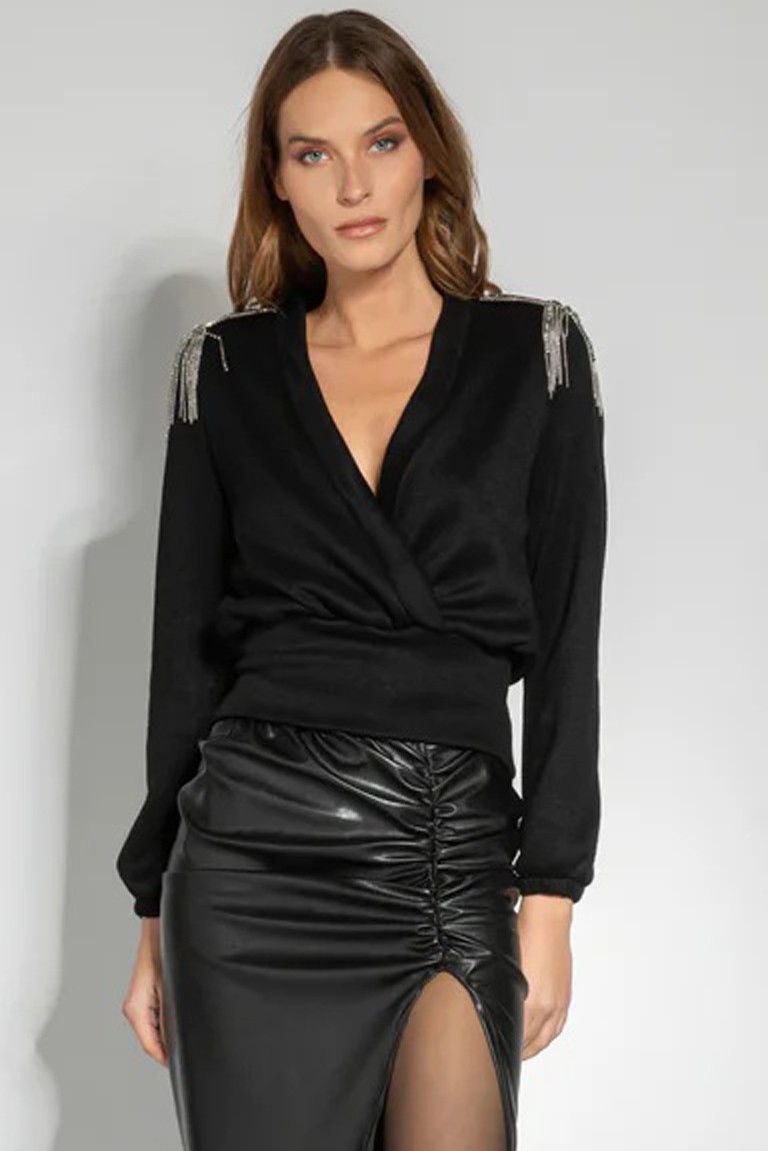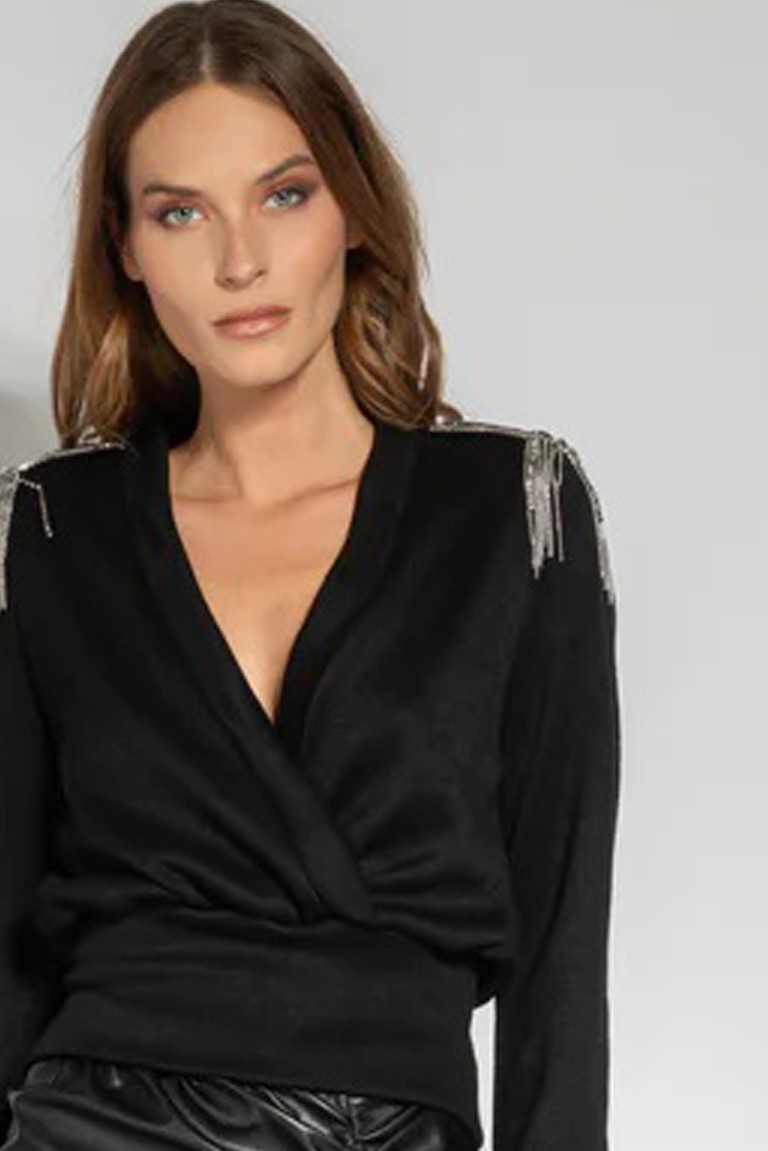 Crew neck sweater with jewel detail on shoulders