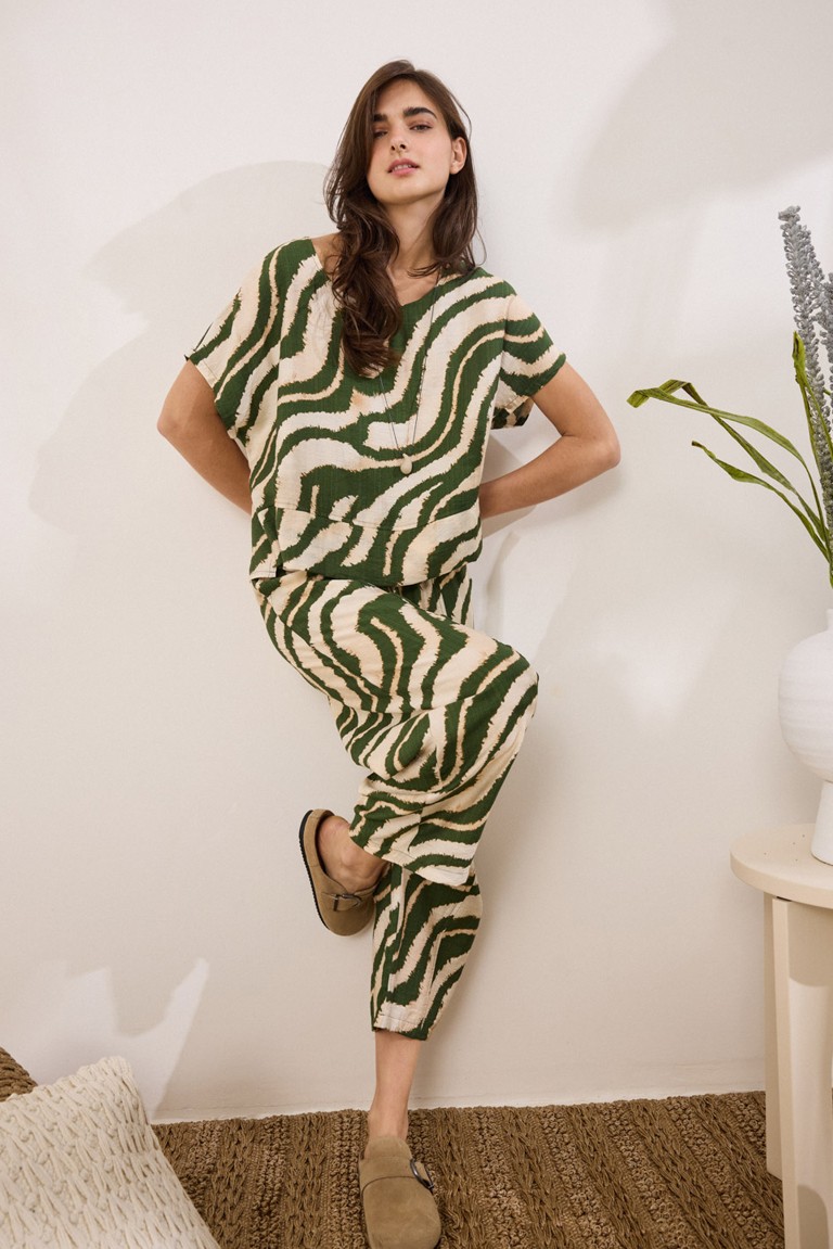 Cropped trousers made of viscose, with a two-tone geometric print. It features sharp pockets on the front, decorative fillets on the back, and a comfortable carrot line, while the elastic at the waist offers extra comfort. The combination with the BENITEZ tunic made of the same fabric completes a harmonious, modern ensemble. 85% viscose, 15% polyester Designed and made in Greece