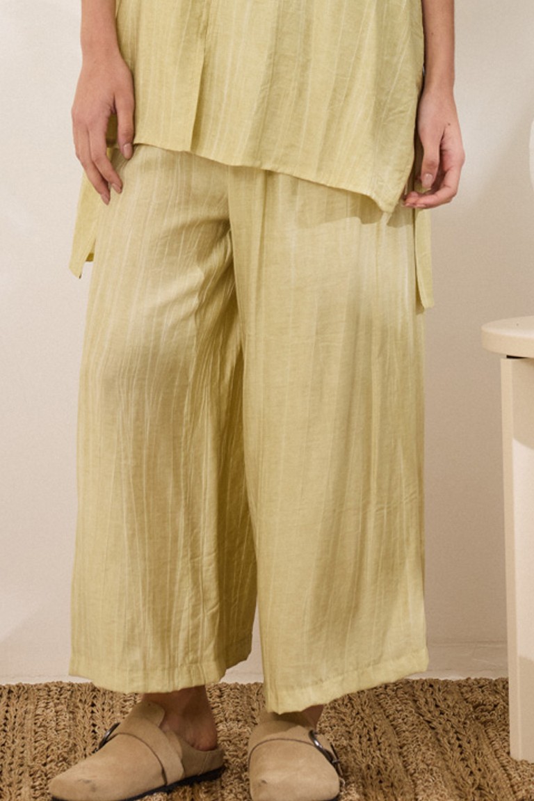 Set with crinkle effect delave, consisting of a long sleeveless top and pants. The top features a V-neck with a center front opening, side openings and an asymmetrical length in a loose fit. The pants have a wide fit, elastic at the waist for a stable fit and practical pockets. It is accompanied by a decorative necklace that completes the set 82% Viscose-18%Nylon Designed and made in Greece