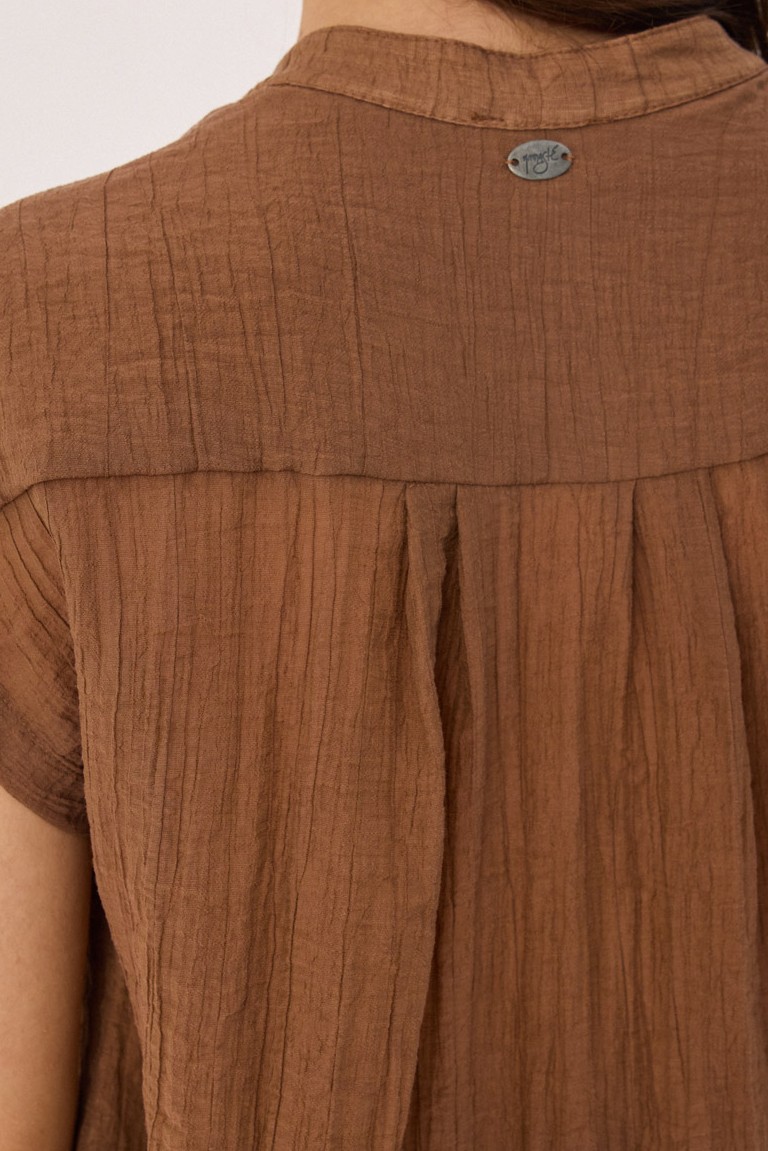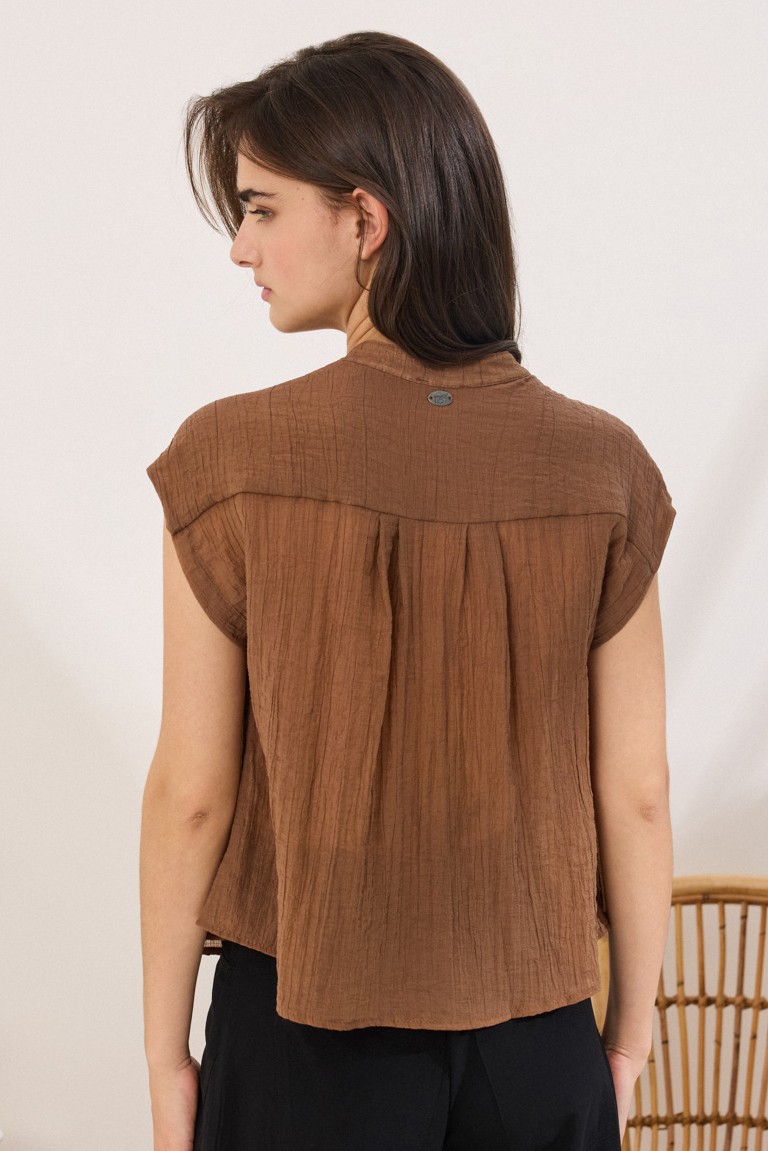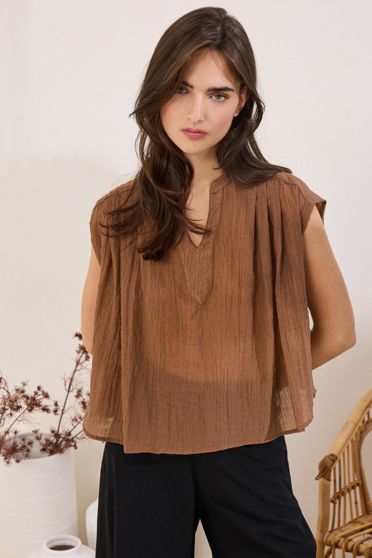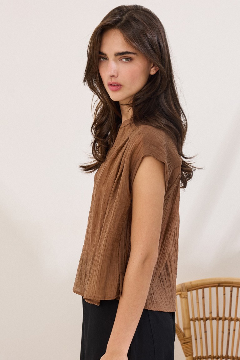 Sleeveless tunic with crinkle effect, in a comfortable fit. It features an anform collar with a V-neckline, while the pleats under the shoulder on the front add subtle structure to the design.