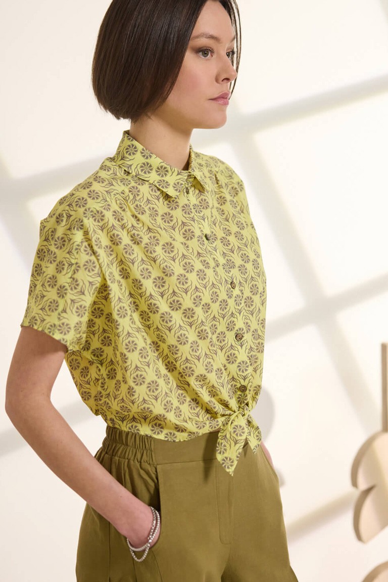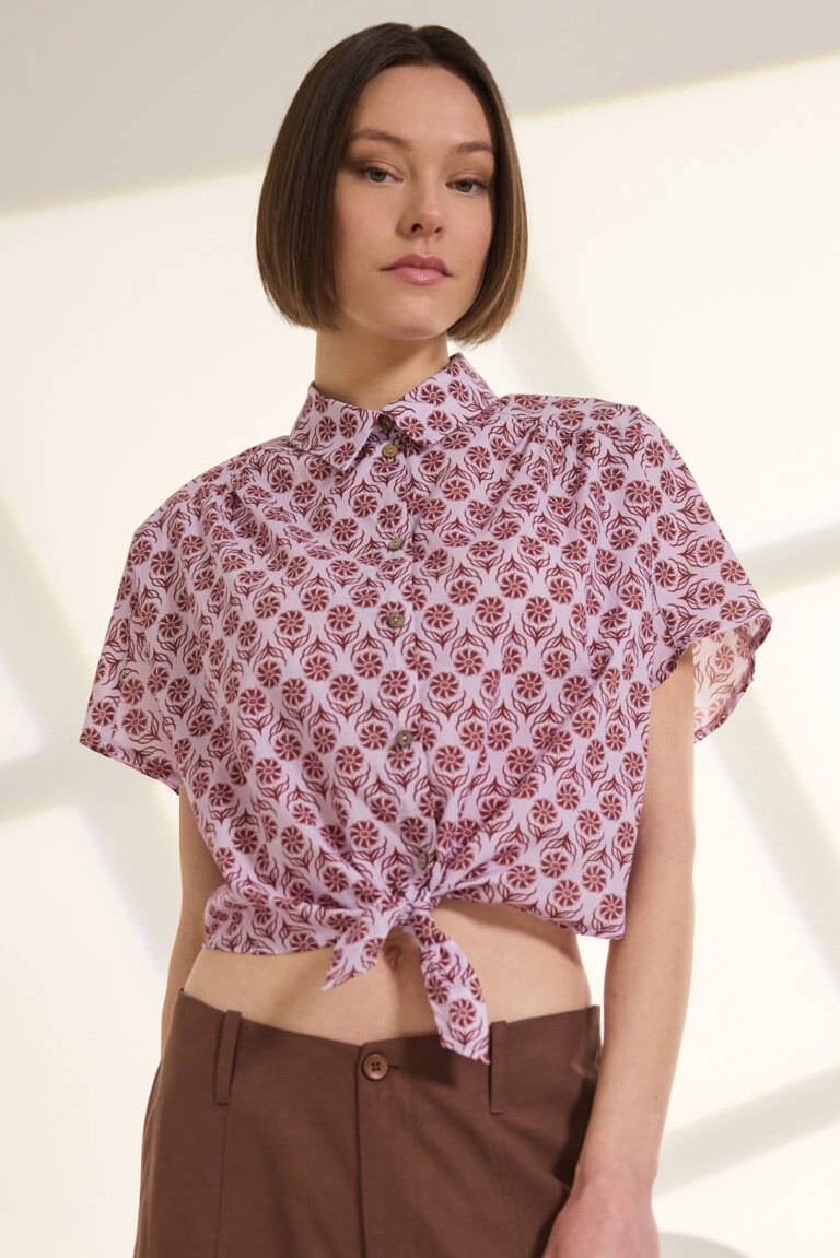 Cropped shirt made of cool 100% cotton, with a collar and front closure that ends in a special tie at the end. It features short sleeves with a slight gather, while the shoulder strap with pleats in the center back, and the elastic at the bottom ensure a perfect fit. The special floral two-tone print completes the design with a modern and dynamic character. “This product has been made with love and respect for the environment using natural fibers.” 100% Cotton Designed and manufactured in Greece