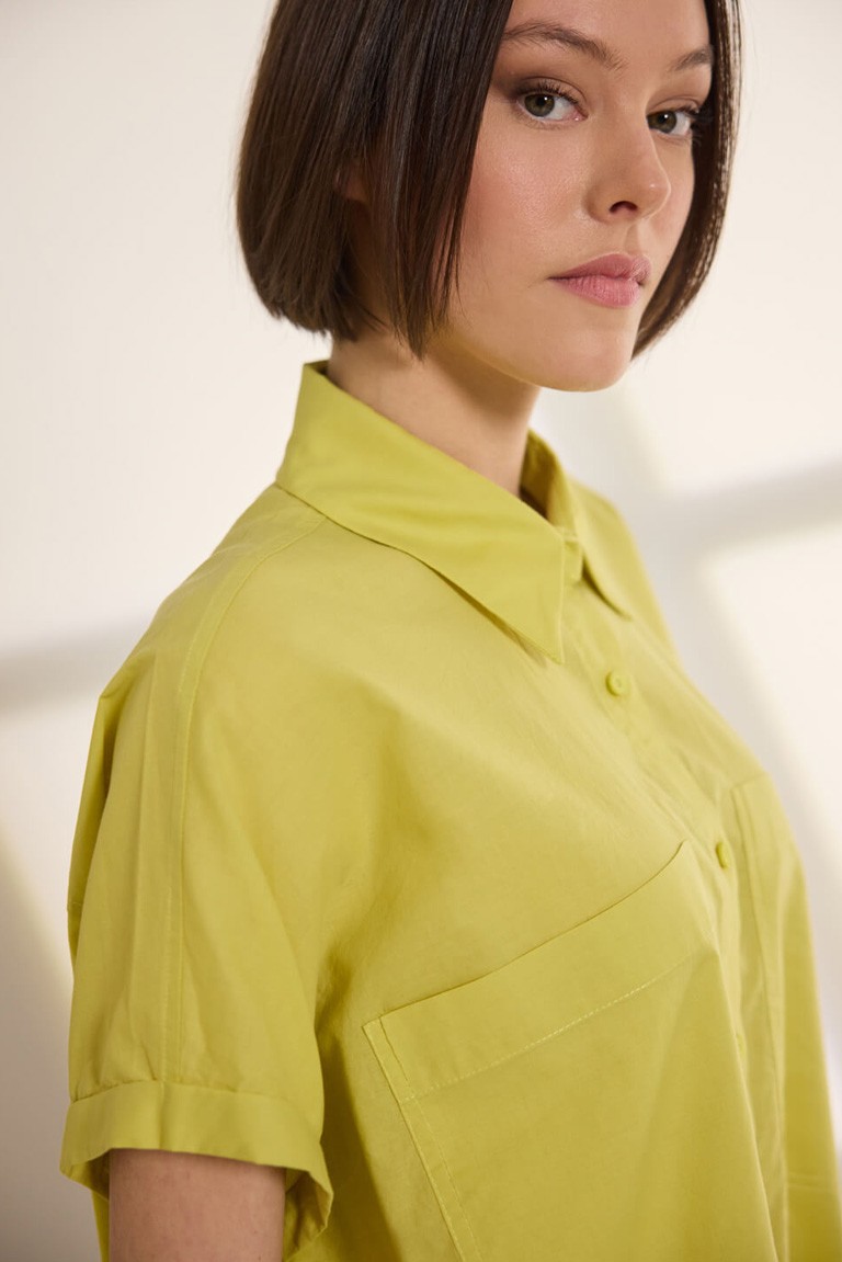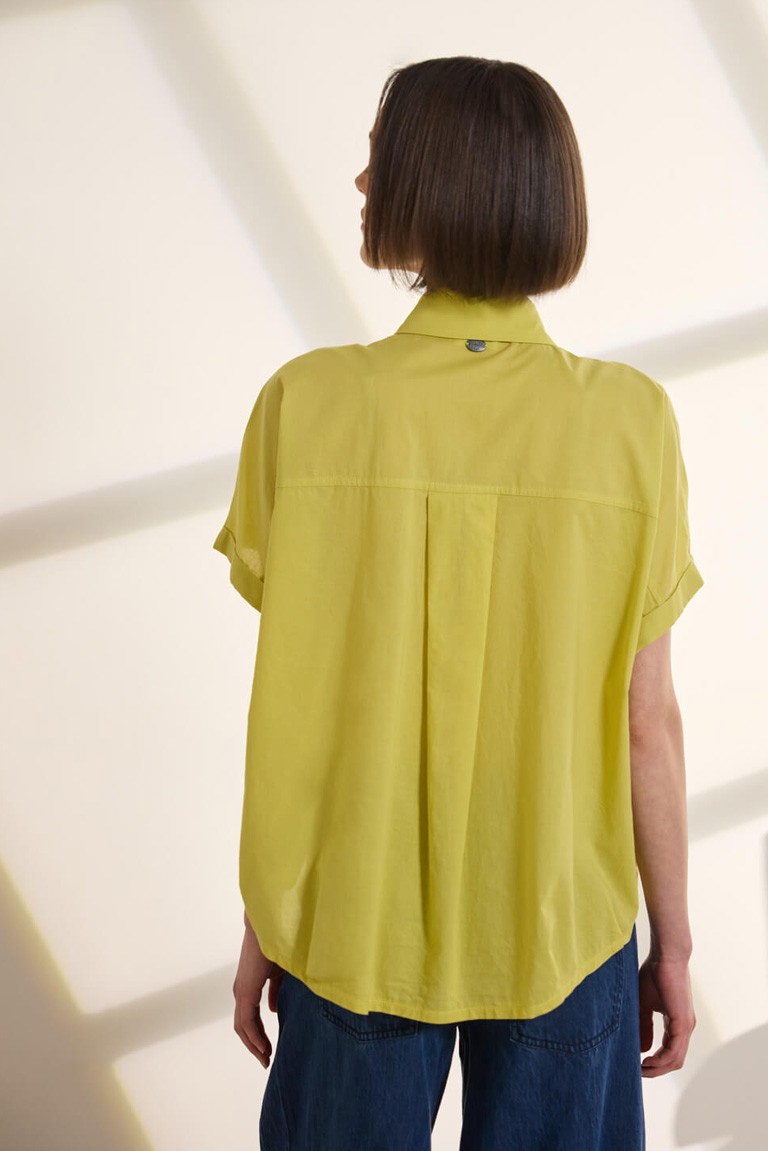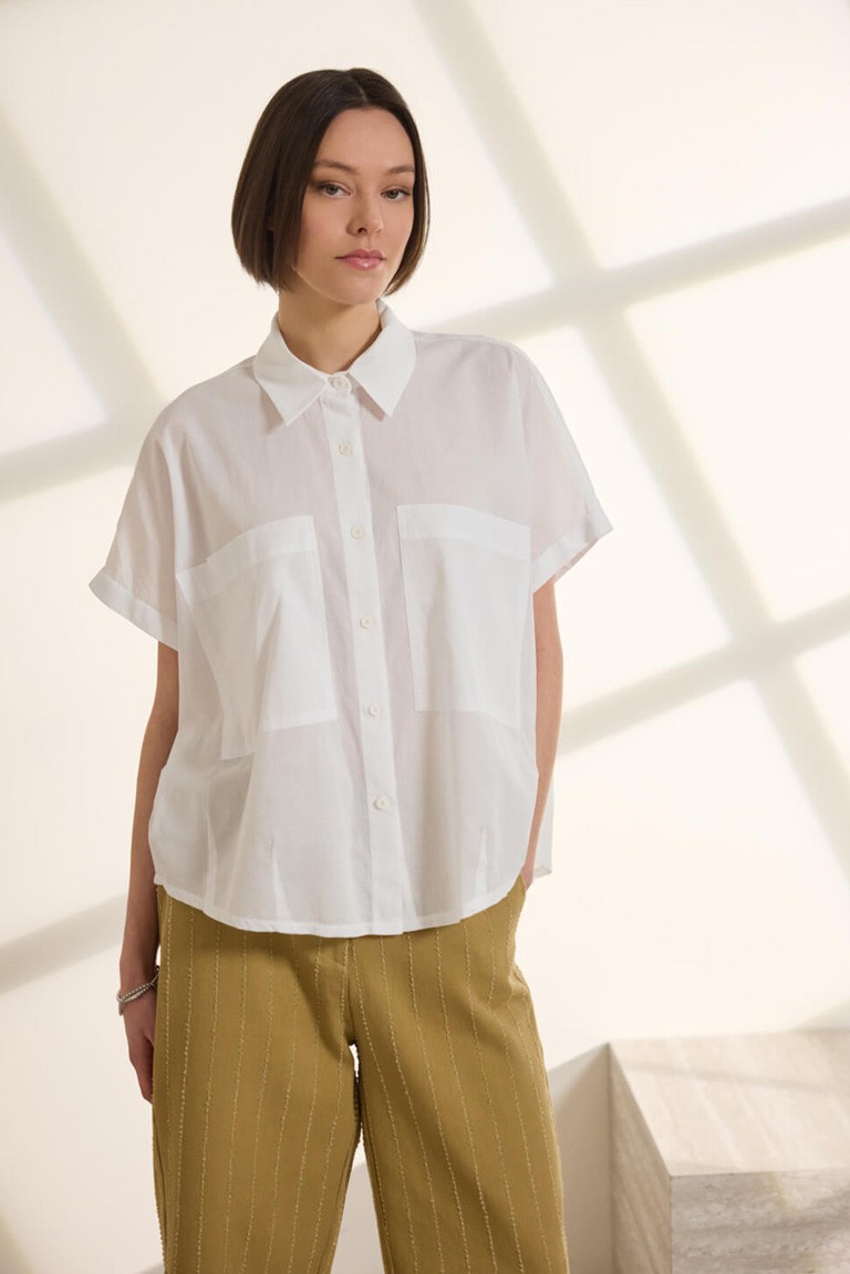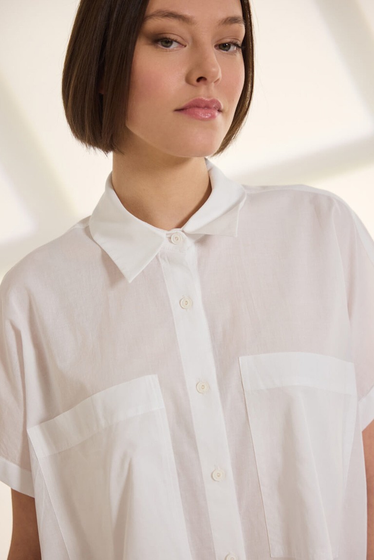 Shirt with a classic collar made of 100% cotton, which closes with buttons at the front. The discreet asymmetrical cut adds interest, while the short sleeves with lapels offer an additional stylistic detail.