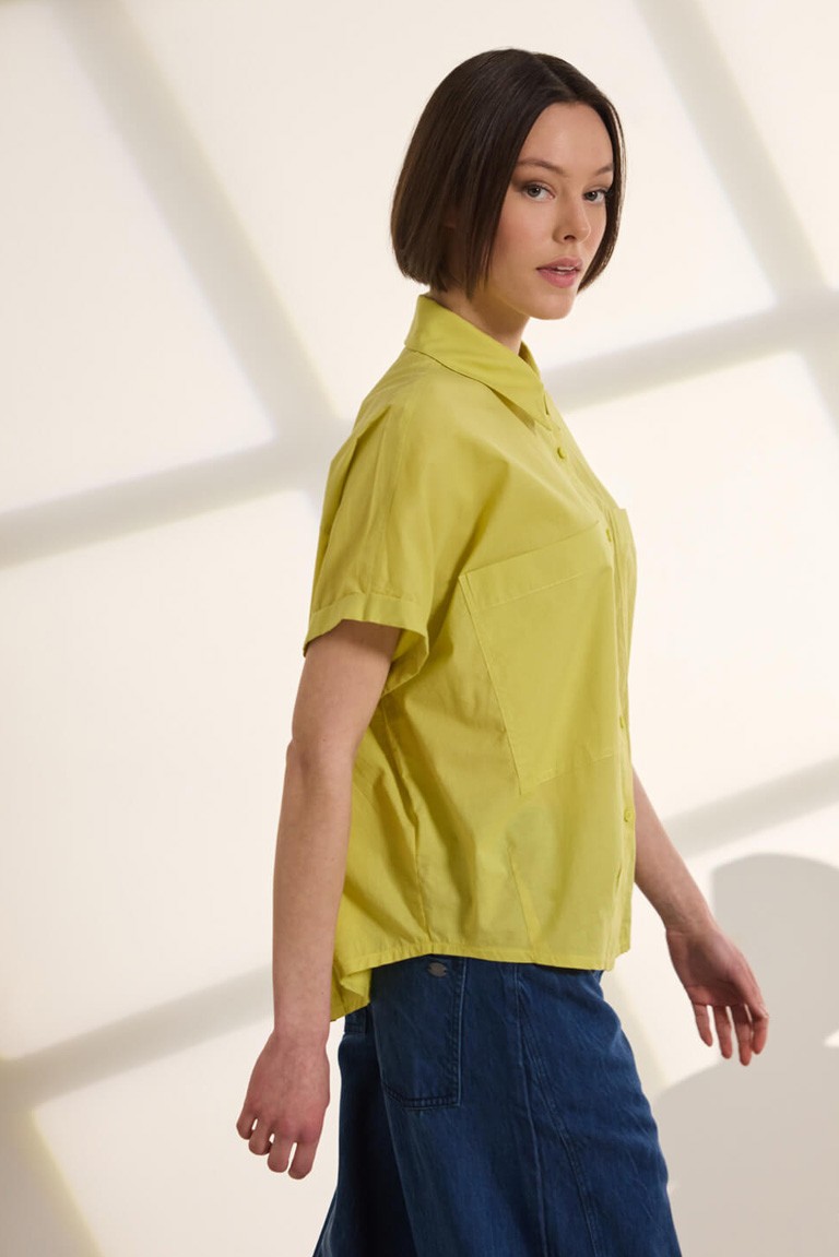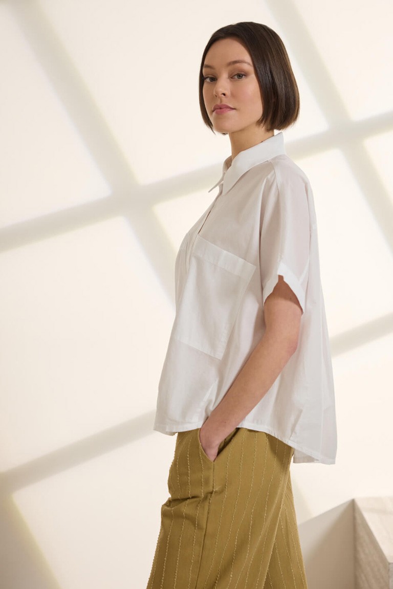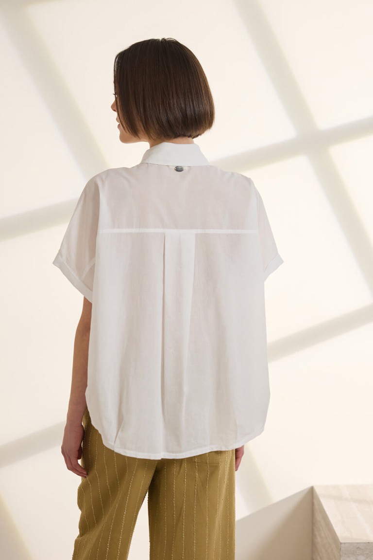 Shirt with a classic collar made of 100% cotton, which closes with buttons at the front. The discreet asymmetrical cut adds interest, while the short sleeves with lapels offer an additional stylistic detail. The open pockets and the designer darts on the front give a modern feel, while on the back the shoulder strap and the placket enhance the airy and light line of the garment. “This product has been made with love and respect for the environment using natural fibers.” 100% Cotton Designed and manufactured in Greece