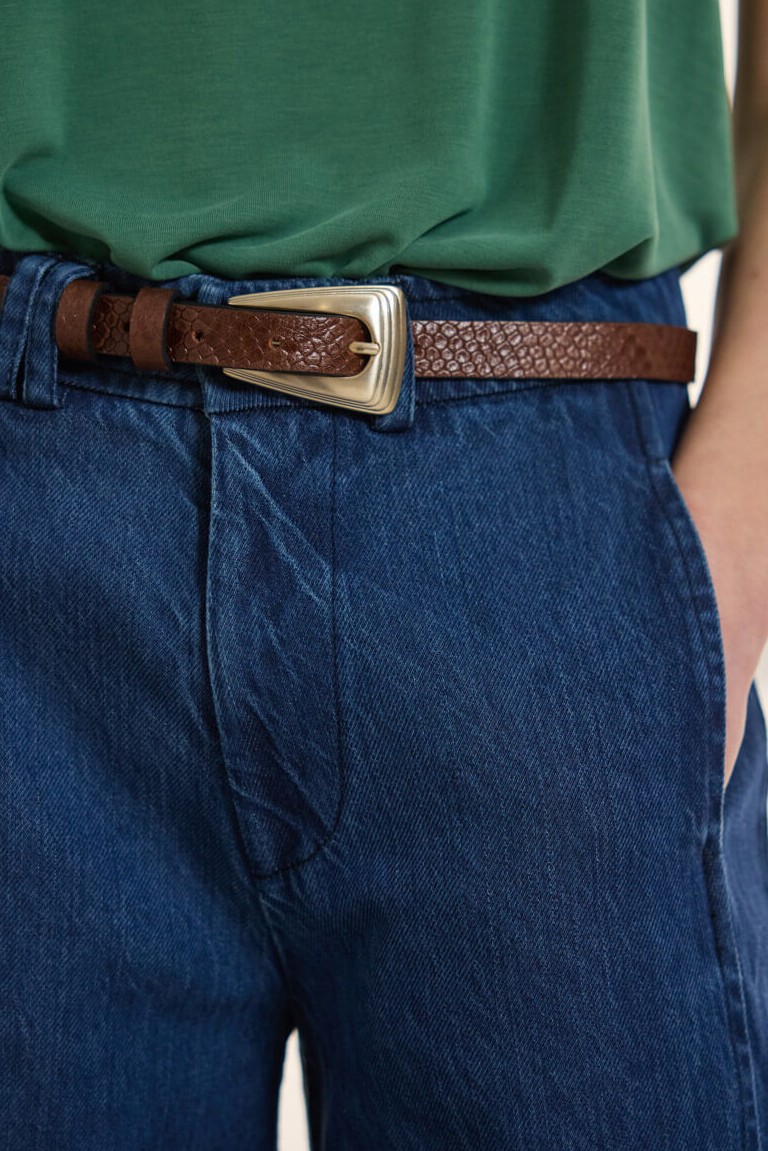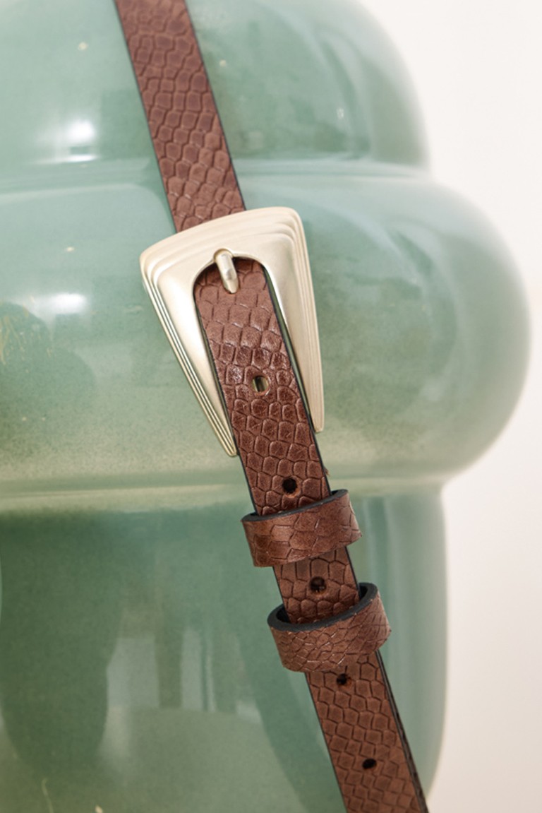 Leather belt with a snake-like texture and embossed surface that gives it a special aesthetic. It has a length of 1 m and a width of 2 cm. It adjusts to the waist thanks to the 8 holes, ensuring a stable and easy fastening. It is completed with a metal buckle in a simple line, which enhances the timeless appearance of the design. 100% Leather Designed and manufactured in Greece