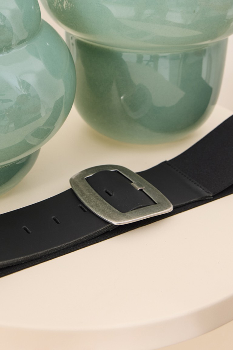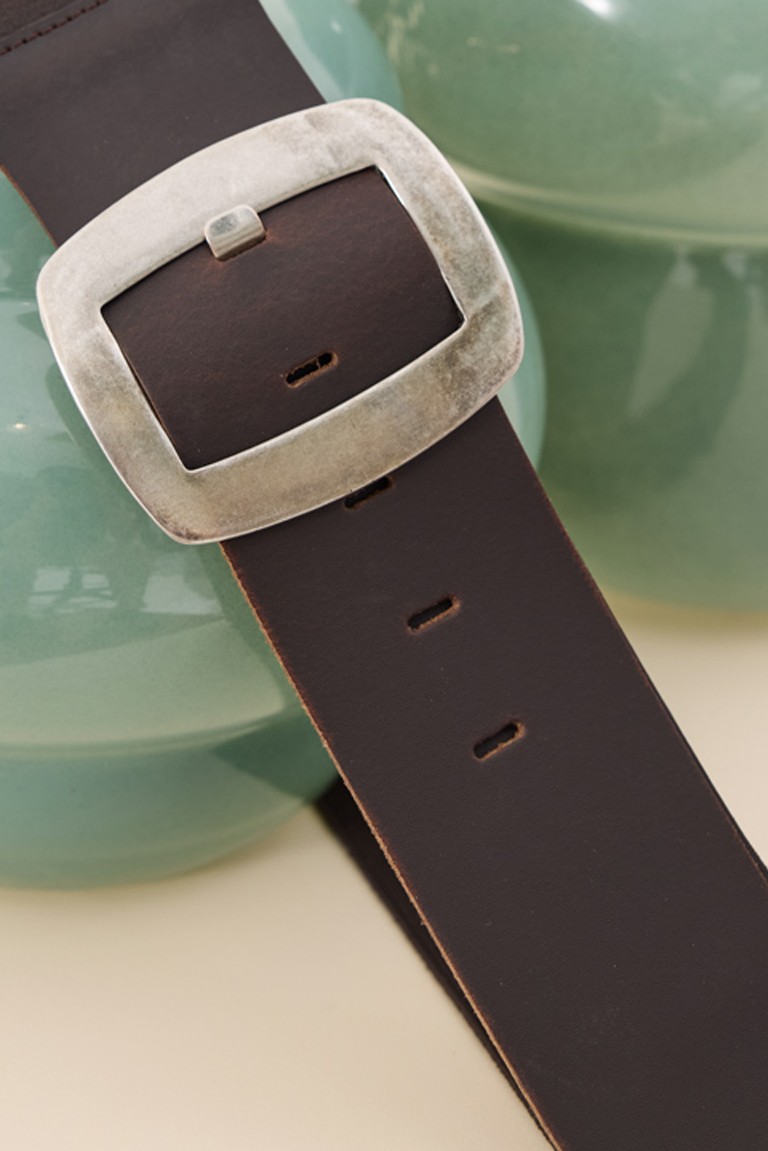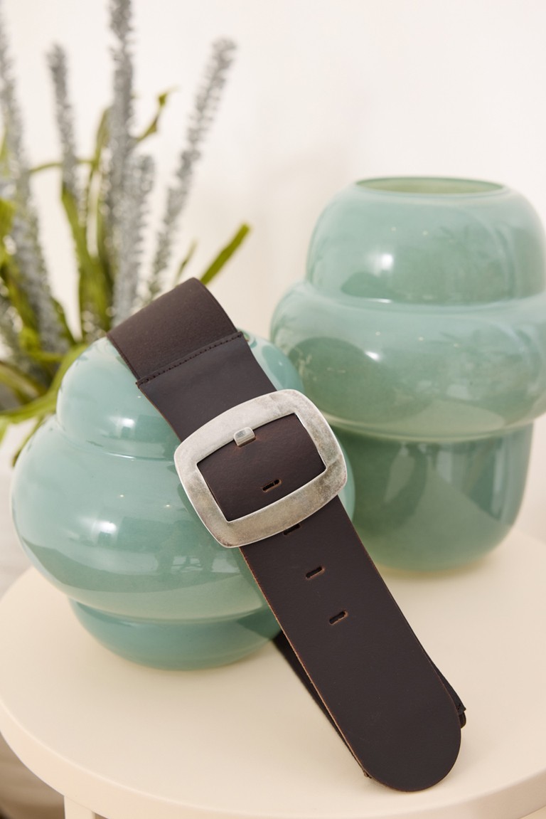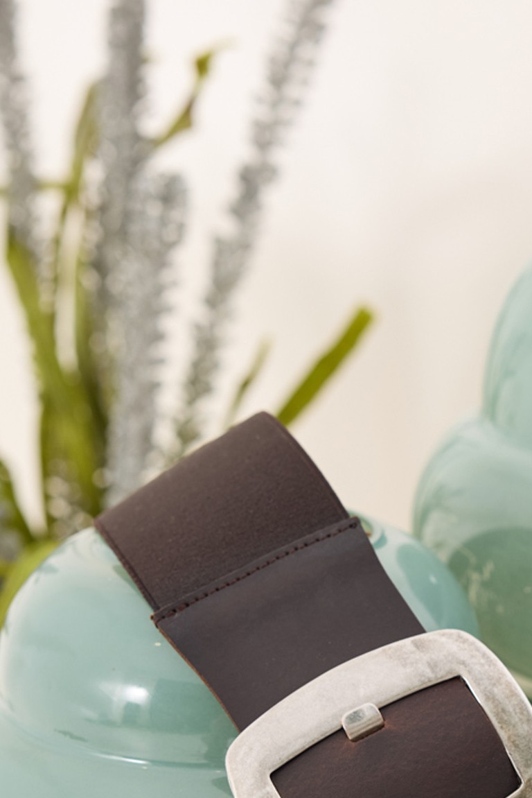 Belt with a leather front and elastic back, ensuring a comfortable and stable fit at the waist. It features a square buckle, while the five adjustable holes offer ease of use and adaptability. 100% Leather Designed and manufactured in Greece