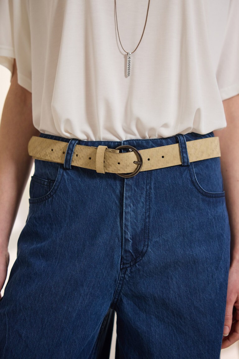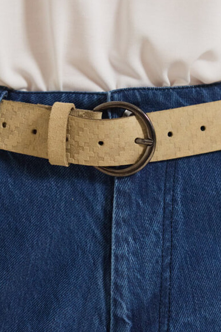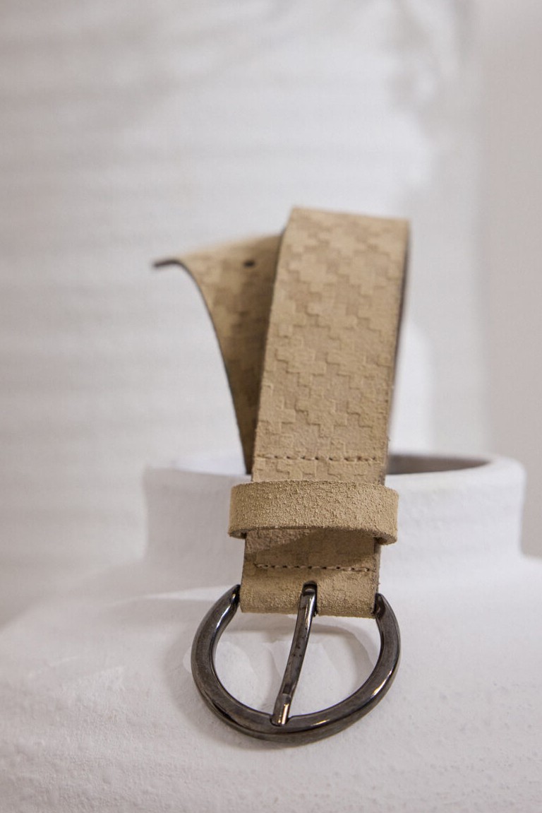 Suede leather belt with an embossed geometric pattern that adds depth and texture to the surface. It has a length of 1 m and a width of 3.5 cm. The 9 holes allow for easy adjustment, while the round metal buckle in a dark finish completes the design. 100% Leather Designed and made in Greece