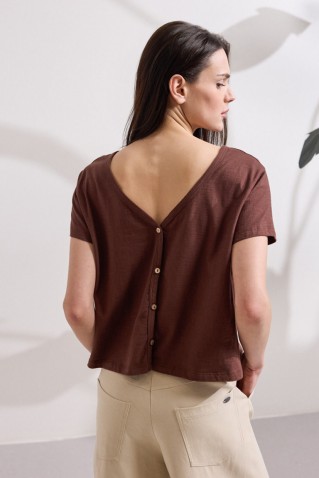 100% cotton blouse, with short sleeves and an open neckline at the front. The back is shaped with a V opening and button closure along the entire length of the back, adding a special design element...