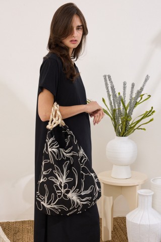 Small handbag made of 100% cotton with contrasting embroidered flowers. It closes with a zipper at the top and has a wide pocket in the center that easily passes over the wrist for a comfortable grip.